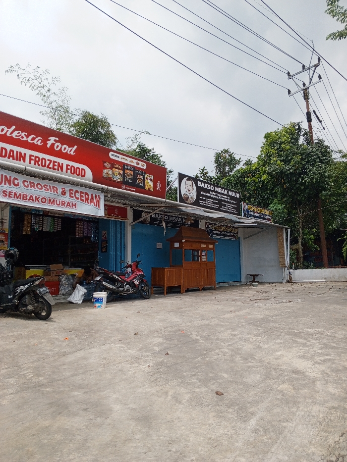 The image displays an outdoor street scene in Multhan, India, under an overcast sky. The foreground consists of a light grey paved surface. On the left, two motorcycles are parked; one dark in color, the other red, positioned near a white bucket on the ground. Directly behind the motorcycles is an open storefront with a large red sign overhead that reads "Solesca Food" and "BAKULAIN FROZEN FOOD." A white banner below the red sign states "PUSAT KULAKAN GROSIR & ECERAN SEMBAKO MURAH." Inside this store, a solitary individual is seated, partially obscured by merchandise. Adjacent to the open storefront, two commercial units are present, distinguished by closed blue roll-down metal shutters. In front of these blue shutters, a light brown wooden food cart with a peaked roof is centrally positioned. Above the blue shutters, a black rectangular sign displays "BAKSO MBAK NUUR" alongside a white logo featuring a cartoon baby's head. To the right of the wooden cart, near the closed shutters, a small, dark, round table or stool is visible on the paved ground. Further to the right and in the background, green trees and dense foliage are present. A wooden utility pole with multiple black overhead wires extends vertically into the upper right portion of the frame.
