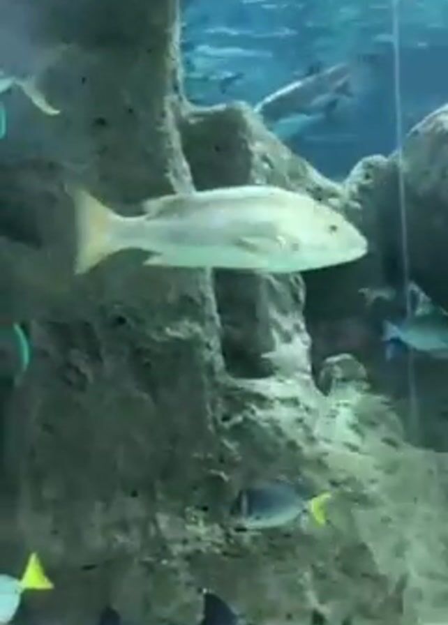 n aquarium with various fish and sharks. Several gray fish with yellow tails swim near a rock formation. In the background, more fish and at least two small sharks are visible. Sunlight reflects off the surface of the water.