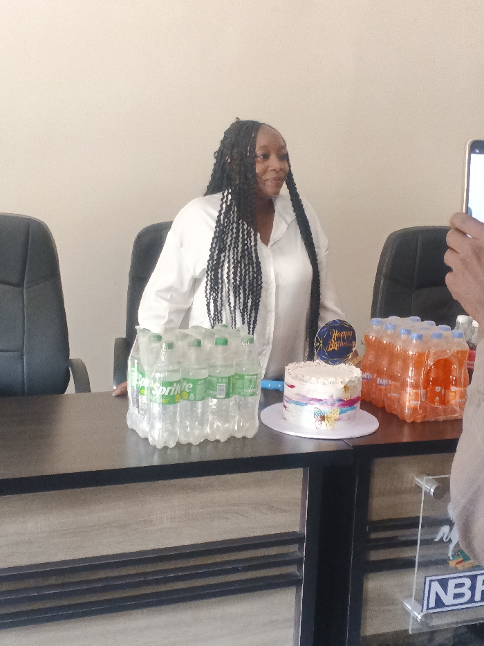 An indoor scene in Jos, Nigeria, depicts a celebratory gathering. A Black female with long, dark braided hair, wearing a white collared shirt, is seated behind a dark-topped table with wooden-paneled drawers. She is smiling and looking towards the right side of the frame. Behind her are two dark, high-backed office chairs, and the background consists of plain, light-colored walls. On the table in front of her, from left to right, are: 1. A shrink-wrapped pack containing twelve 50cl plastic bottles of Sprite. 2. A round, two-tiered birthday cake with white frosting, colorful horizontal stripes, and a yellow butterfly decoration. A blue circular "Happy Birthday" cake topper is inserted into the cake. 3. A shrink-wrapped pack containing twelve 50cl plastic bottles of Fanta. On the far right of the table, a clear acrylic stand with a blue and white logo, possibly "NBF," is partially visible. A person's hand, holding a vertically oriented smartphone, is visible on the far right of the frame, positioned as if capturing the scene.