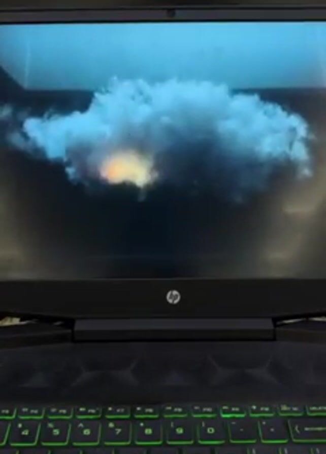 A front-facing shot of an HP laptop. The screen displays a cloud, a blue-greyish color, that appears to be moving and swirling. The keyboard is black with green backlighting.