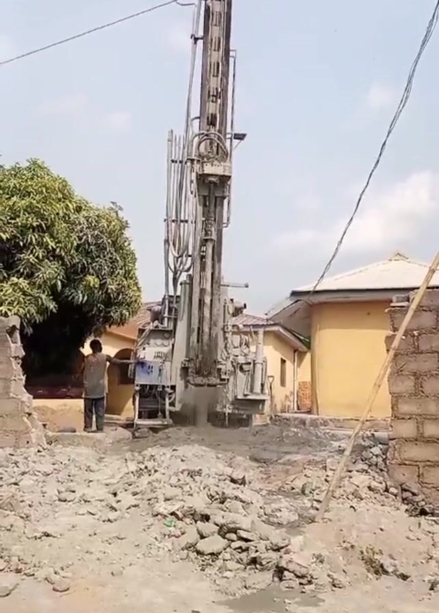 drilling rig operating in a residential area. The rig is tall and grey, and it is drilling into the ground. A man stands next to the rig, seemingly observing the process. Mud and debris are being ejected from the drilling site. In the background, there are houses, a tree, and power lines. A silver Honda Accord drives past the drilling site.