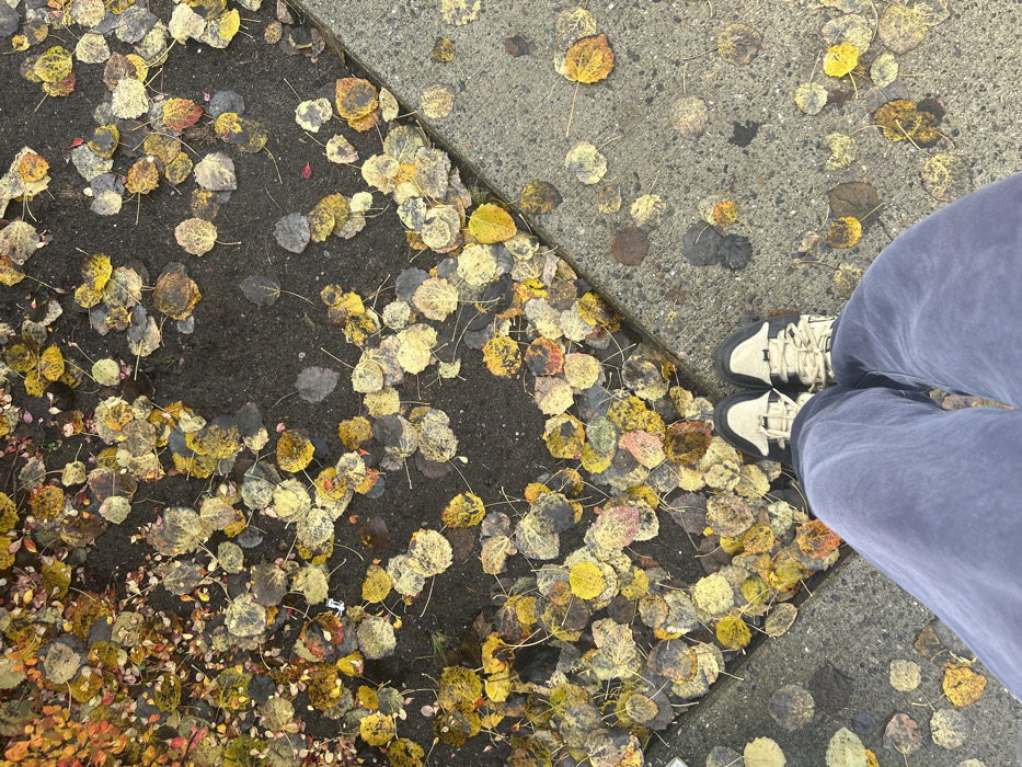 An overhead view captures a person's lower legs and feet positioned on a concrete sidewalk, bordered diagonally by a darker, unpaved ground section heavily covered with fallen autumn leaves