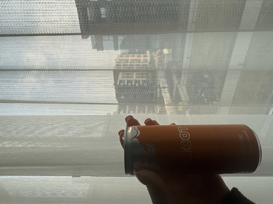 The image displays a human hand holding an orange-colored Red Bull Edition "Apricot" energy drink can in the foreground. The can is primarily orange with a silver top and base, showing the partial word "ICOT" and discernible text "energy drink" and "body and mind." The hand holds the can in the lower-left of the frame, obscuring a small portion of the view. The background consists of an outdoor urban environment, viewed through translucent, off-white, finely woven sheer curtains that cover a window. Through the diffused light of the curtains, several multi-story modern buildings with light-colored facades and repeating window patterns are visible under daylight conditions. The architectural style suggests contemporary urban development. The scene is located in Sofia, Bulgaria, and the elevated perspective indicates an upper floor of a building, such as a residence or hotel, overlooking a modern district of the city. No other individuals or specific landmarks are discernibly present.
