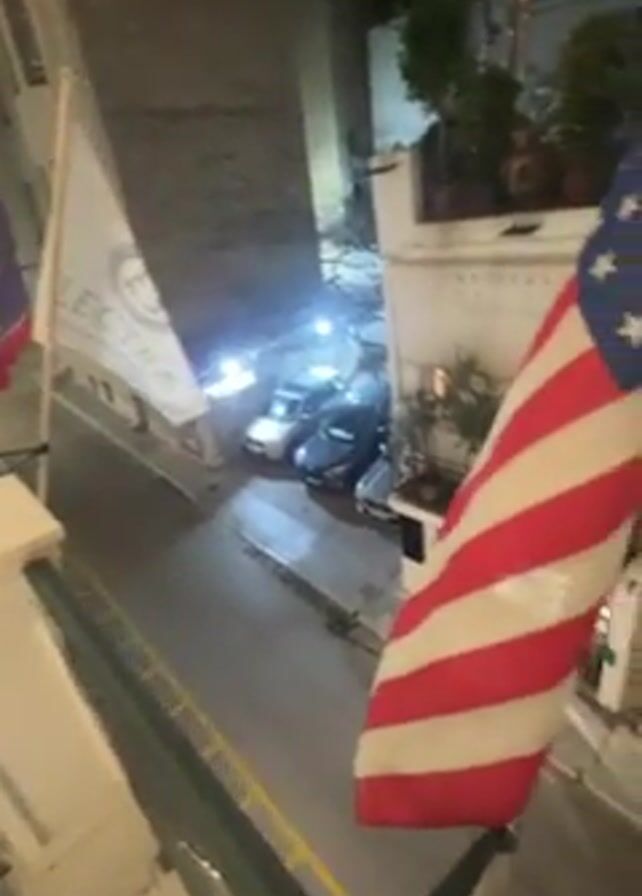street scene at night, filmed from an elevated perspective. Several flags are visible, including the American flag, a Greek flag, and a flag with the word "ELECTRA" on it. The camera pans to show the street below, where cars are parked and a yellow car drives by. The street is narrow and lined with buildings. The lighting is dim, illuminated by streetlights.