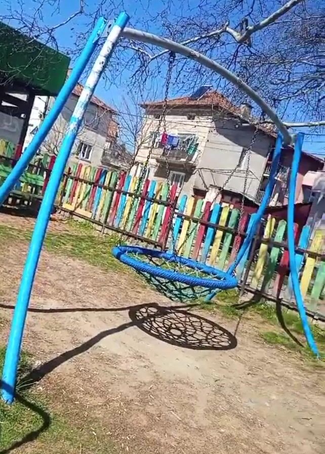 - "playground. The camera pans from left to right, showing a blue tire swing hanging on metal poles. There is a building and a green awning in the background, along with a multi-colored wooden fence. The camera continues to pan to the right, revealing a very large tree behind the fence. The sky is blue and mostly clear." by FM-KiIor1, licensed under CC BY 4.0