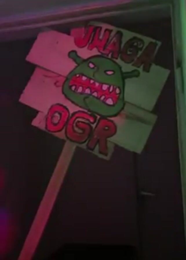 A homemade sign reads “UWAGA OGR” (Attention Ogre) with a depiction of Shrek