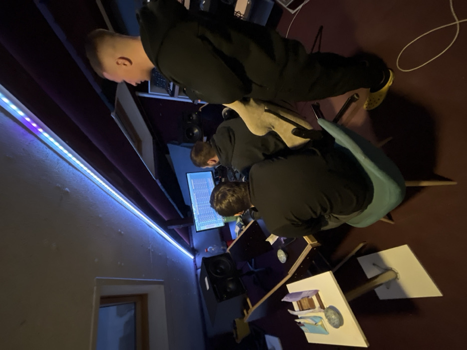 Three adult males are situated within a low-light recording or audio production studio in Saint Petersburg, Russia