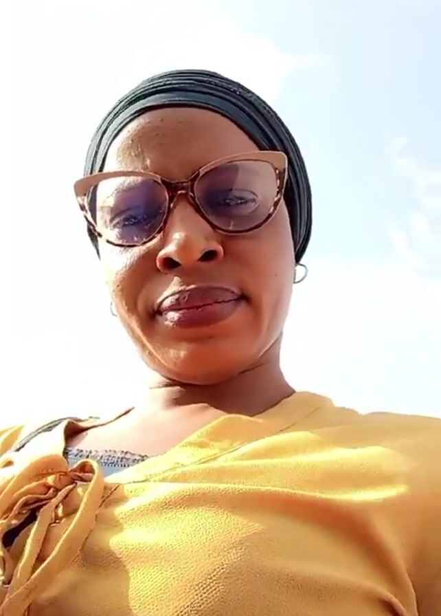 The video features a woman in a mustard yellow shirt, wearing eyeglasses and a black head wrap. She looks directly at the camera from a low angle. The background shows a bright sky with some clouds. There are engine sounds suggesting she might be in or near a moving vehicle.