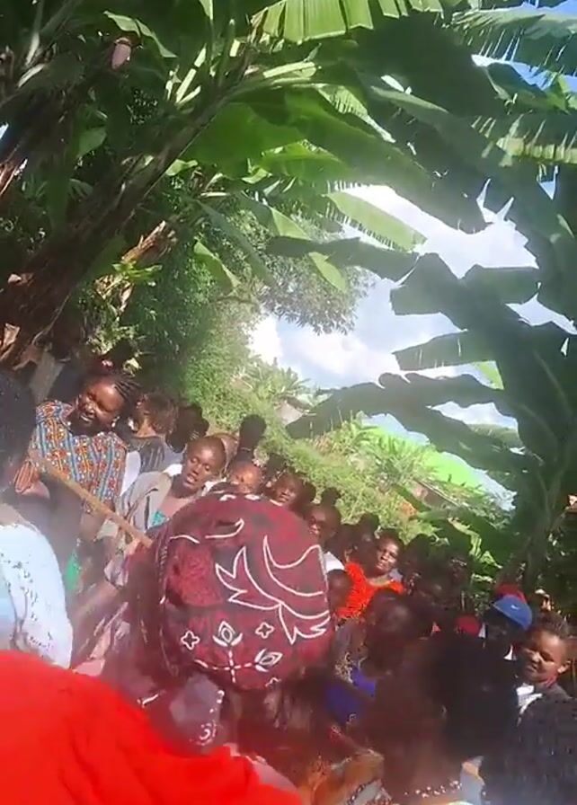 A crowd of people, mostly women, are gathered outside under a canopy of lush, broad-leafed trees. They are closely packed together, and many are smiling and looking in the same direction. A few women are holding a long, thin branch and appear to be pulling on it. The crowd seems to be participating in or observing some type of activity or game. The surroundings feature a variety of foliage and a glimpse of the sky.