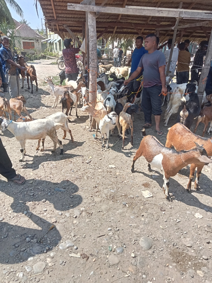 The image displays an active outdoor animal market located in Lhoksukon, Indonesia