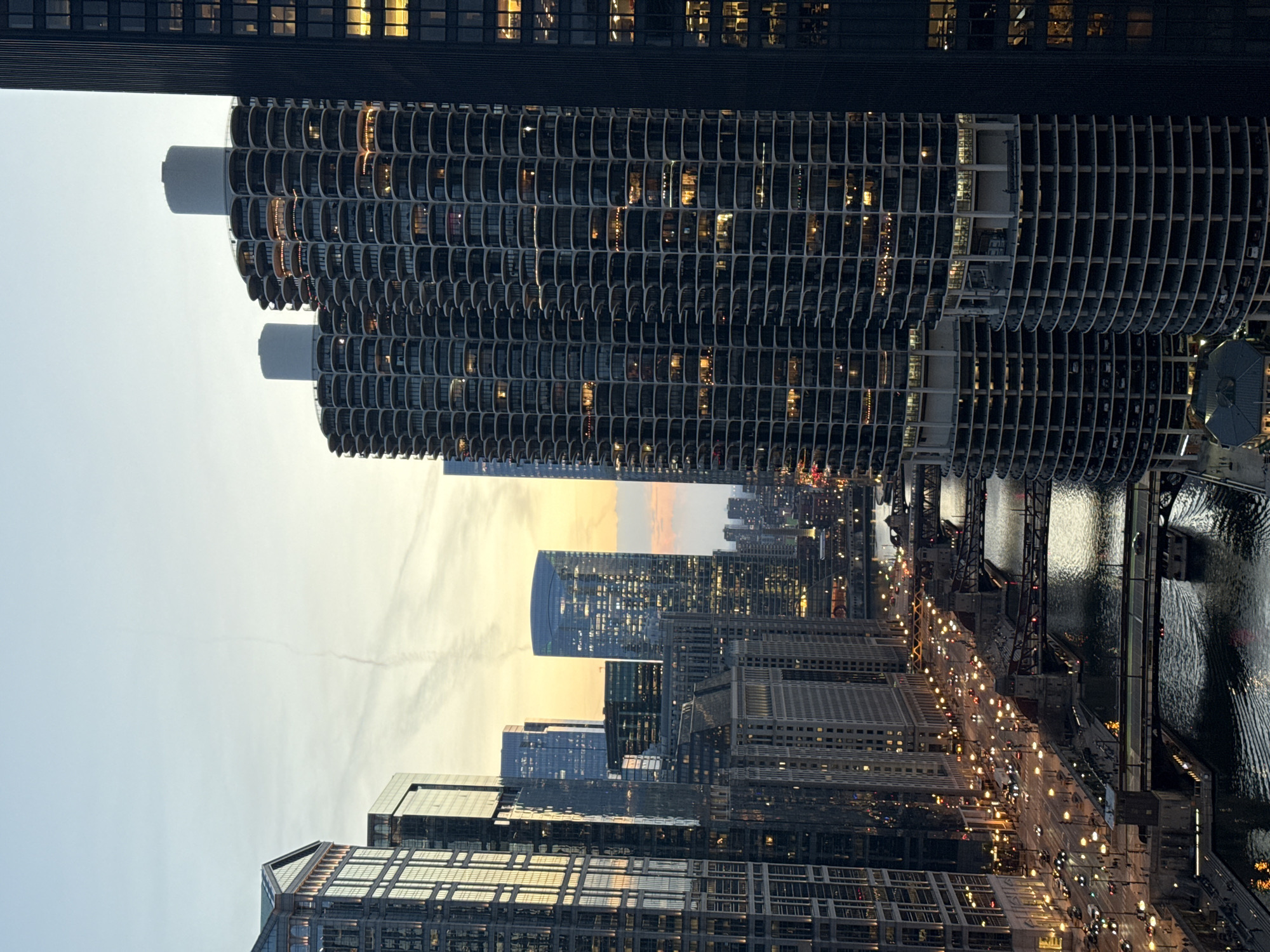 The image captures an evening cityscape in Chicago, Illinois, USA. The foreground is dominated by the iconic Marina City towers, recognizable by their cylindrical, balconied design, with lights emanating from various apartments. A taller, more angular skyscraper stands adjacent to Marina City. In the middle ground, a row of buildings stretches into the distance, with the Chicago River visible. The streets are lit with car headlights and streetlights. The sky is a blend of soft orange and grey, suggesting dusk.