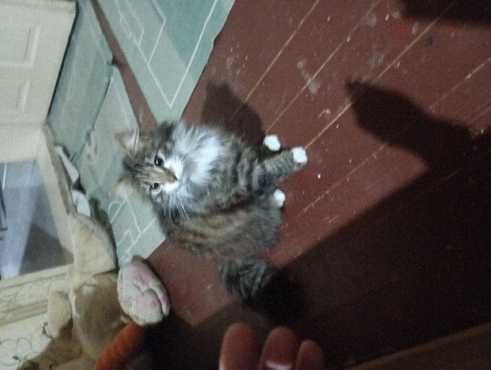 - "In an indoor residential setting in Alfatar, Bulgaria, a long-haired domestic tabby cat is centrally positioned on a dark reddish-brown wooden floor" by FM-75hZp2, licensed under CC BY 4.0
