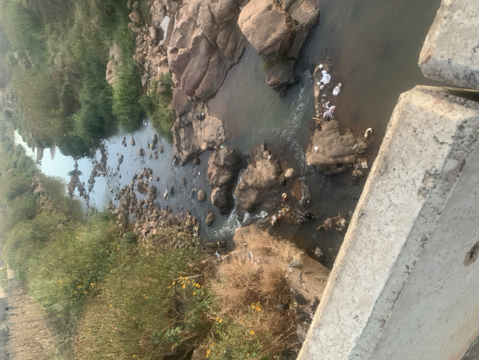 A river winds through a rocky landscape with green vegetation lining the banks. The water is murky, with visible debris scattered among the rocks and along the edges. The composition includes a concrete structure, likely a bridge or platform, positioned on the right side of the frame, offering an elevated perspective of the scene. The overall tone suggests an environment with both natural beauty and signs of pollution.