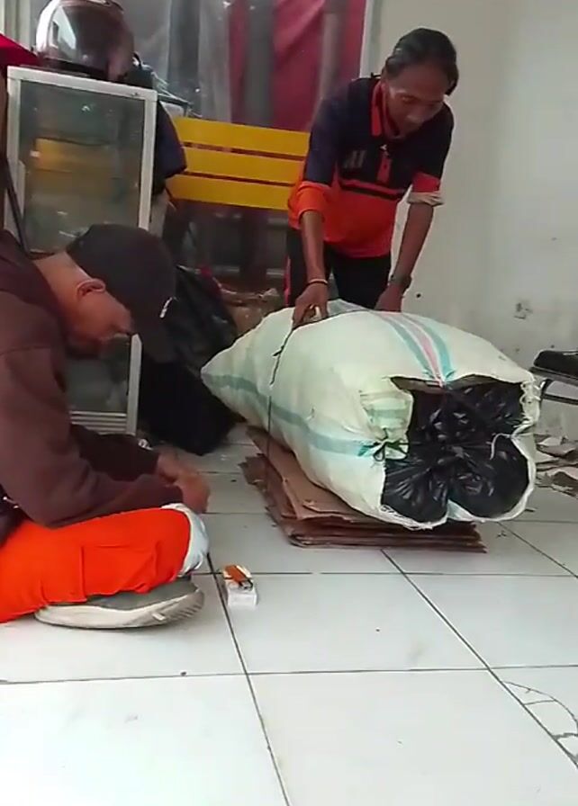 Inside a tiled room, two men dressed in orange work uniforms, one wearing orange boots, sit against a white wall. The second man is looking up and gesturing with his hand. A third man is sitting with his legs crossed, facing the wall, looking at his phone. A fourth man is kneeling by a large white bag filled with smaller black bags, trying to lift it. The bag is on top of a piece of cardboard. There is a helmet on top of a display cabinet to the left of the bag. In the first scene the man with orange trousers is lighting a cigarette.