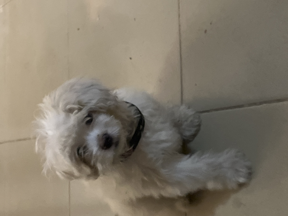 A small, light-colored dog, likely a puppy, with fluffy white or very light cream fur, sits centered in the frame. The dog has dark eyes, partially obscured by its fur, and a dark nose. It wears a plain, dark-colored collar. The dog is positioned on a light-colored tiled floor, with visible grout lines forming squares. The lighting appears consistent with an indoor environment. Small, dark specks are scattered on the floor. The exact location within the city of Jos, Nigeria, cannot be determined from the visual information provided.