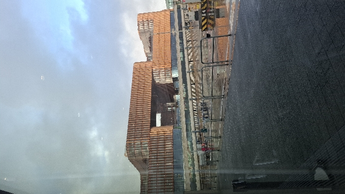 The image depicts an exterior scene in Niederanven, Luxembourg, viewed through a reflective glass surface. In the foreground, a dark grey paved surface appears wet, exhibiting reflections of the sky and a prominent building. A series of silver-colored metal barriers with horizontal rails extends across the mid-ground. The central subject is a multi-story, modern architectural building characterized by a facade composed of numerous horizontal, rust-colored panels, creating a textured or corrugated appearance. This building features large glass sections and a distinct rectangular opening or archway within its central mass. Below the main rust-colored structure, a darker, possibly blue-tinted glass or paneling section is visible. Elements consistent with a construction site, including temporary fencing and a yellow and black striped warning barrier, are present at the building's base. The background consists of an overcast sky, predominantly light grey with some lighter blue patches. Reflections from interior elements are visible on the glass surface through which the photograph was taken, notably in the upper sky portion. No individuals are present, and no active interactions are depicted. The wet ground indicates recent precipitation.