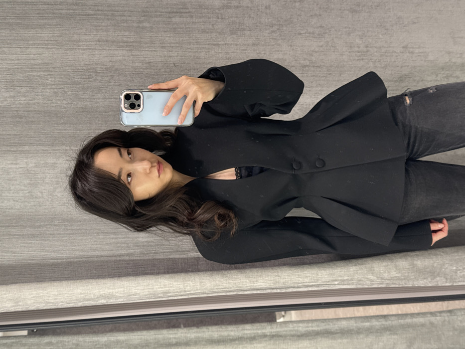 A young adult female with dark, wavy hair and East Asian features is captured in a mirror selfie within an indoor commercial space, likely a retail fitting room, located in Moscow, Russia. She is wearing a structured black blazer featuring a high, open collar, pleats at the waist, and two visible buttons, revealing a black lace-trimmed top underneath. Her lower attire consists of distressed dark-wash jeans with visible rips on the right thigh. She holds a light blue smartphone with a clear case in her left hand, positioned to capture her reflection. The background behind her left shoulder reflects a light grey curtain or fabric panel, while the area behind her right shoulder displays a textured grey wall panel with vertical lines. Her expression is neutral, and she gazes slightly to her right, out of the frame.