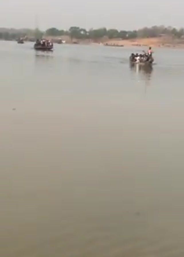 wide, calm river with several small boats carrying people. The boats appear to be moving towards the opposite shore, which is visible in the background and is lined with trees. The water is a murky color, and the sky is overcast. There is also some footage of a wooden structure along the riverbank. Overall, the scene depicts a serene river crossing.