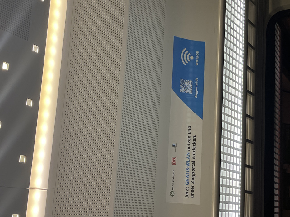 The image displays a forensic view of the interior ceiling and upper wall of a modern train carriage, located within Echterdingen, Germany. The ceiling features light grey, perforated panels designed for acoustics or ventilation. Overhead illumination is provided by two distinct lighting fixtures: an upper linear strip of warm-toned LED lights interspersed with square recessed spotlights, and a lower linear fixture covered by a grid diffuser, emitting white light. Affixed to the upper wall below the lighting is a white and blue rectangular adhesive sign. This sign prominently displays the logos for "S Bahn Stuttgart" and "DB," along with a third, smaller, stylized logo. The German text on the sign reads, "Jetzt GRATIS-WLAN nutzen und unser Zugportal entdecken," which translates to "Now use FREE Wi-Fi and discover our train portal." The right side of the sign, in blue, features a QR code, the web address "Zugportal.de," and a Wi-Fi symbol accompanied by "WIFI@DB." No individuals, active interactions, or specific seating arrangements are visible within the captured frame.