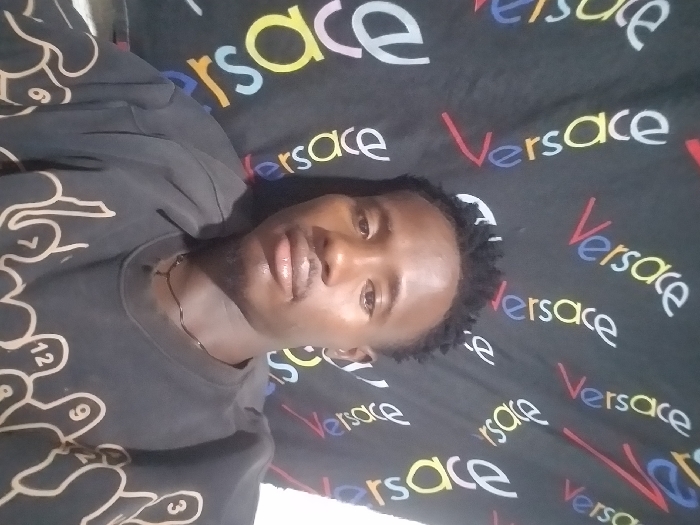 A young man poses for a selfie, wearing a black t-shirt with a white clock-like design on the left. He sports a thin gold necklace. The background is a black Versace-themed backdrop, featuring the word "Versace" in various colorful fonts. The photo is lit from the front, casting shadows and highlighting his features. The image is slightly rotated.