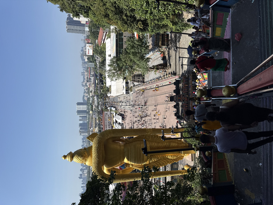 A golden statue stands prominently with city buildings in the background under a bright blue sky. A large crowd gathers along a walkway leading to a temple adorned with colorful decorations. People ascend steps, some observing from the railings. Lush greenery frames the scene, giving a sense of altitude.