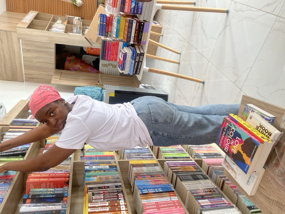 A young woman with a pink bandana is "floating" horizontally in a bookstore, supported by stacks of books. She wears a white t-shirt and blue jeans, with her arms outstretched over the book shelves. The shelves are filled with books, including "Sweet Heat Bolu Babalola," "AMERICANAH," "SANKOFA," and "Love in Colour Bolu Babalola" prominently displayed. Books are also stacked on a nearby table. The store has light-colored wood fixtures and white tiled floors.