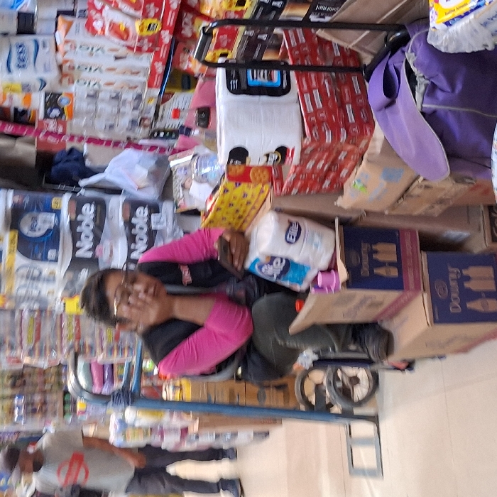A person with glasses and a pink shirt sits amidst a grocery store setting, surrounded by stacks of merchandise like toilet paper, paper towels, and Downy boxes. They appear to be holding a phone. A shopping cart filled with goods is visible, indicating they may be shopping or working in the store. Another person walks past, adding to the busy atmosphere.