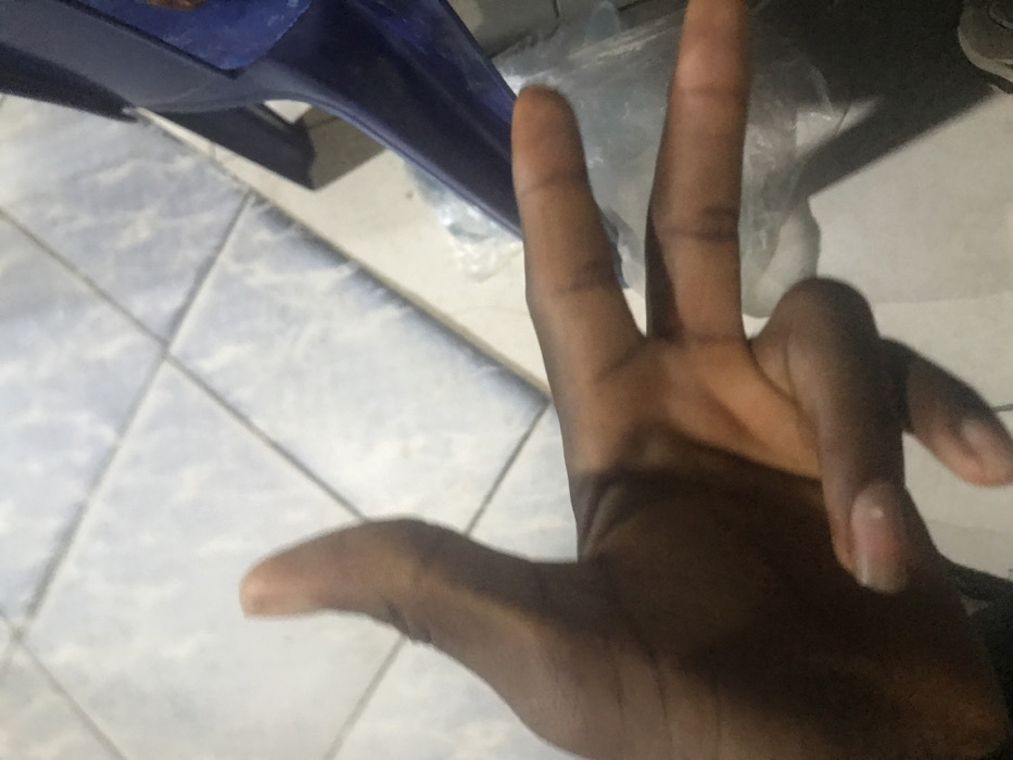 A darkly complected hand appears prominently in the frame. Two fingers are extended upwards, forming a "V" shape. The thumb is stretched outwards, away from the other fingers. The remaining fingers are folded inward. In the background, there is a blue object and a tiled floor with a white pattern. A plastic bag is also visible near the top right.