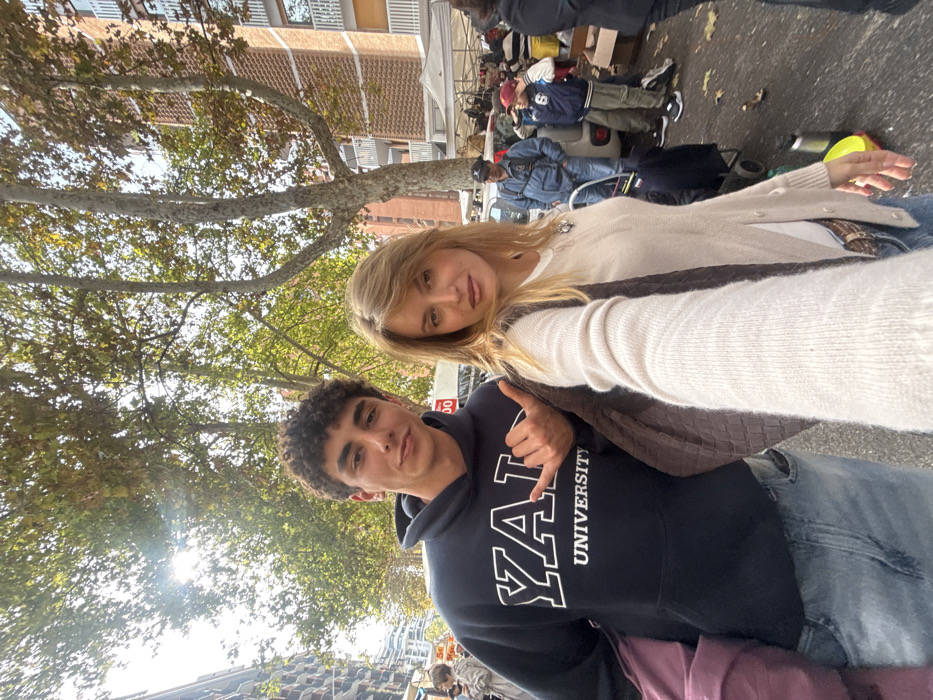 An outdoor, eye-level selfie captures a young man and woman at a street market in Rome, Italy, beneath deciduous trees with late-season leaves. In the foreground, a young man with curly dark hair wears a navy 'YALE UNIVERSITY' hoodie and light-wash jeans; his right hand forms a 'shaka' gesture. To his right, a young woman with long blonde hair holds the camera to capture the image, wearing a light-colored button-front cardigan, blue jeans, and a brown belt; a dark brown quilted bag is slung over her left shoulder. Both individuals gaze directly forward. The background reveals a bustling street market with numerous indistinct figures browsing various goods displayed under white canopies. Red signs, partially obscured, display '00' and '5€'. Multi-story residential buildings with visible windows and balconies flank the scene. Bright daylight filters through the tree canopy.