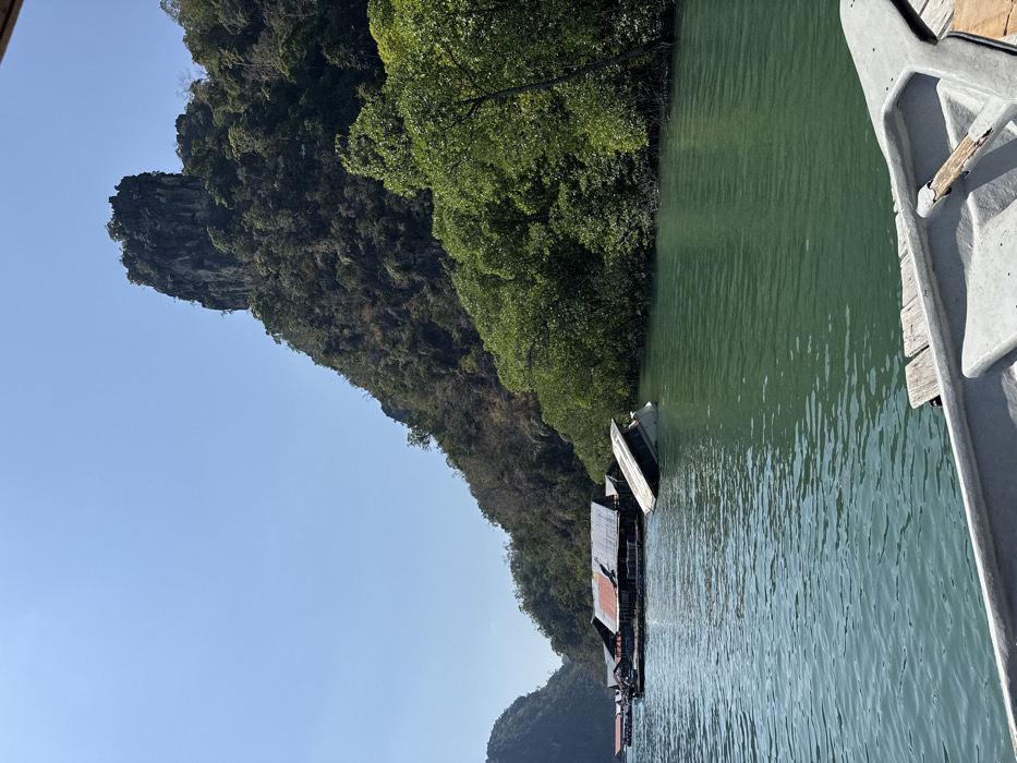A serene scene features a tranquil body of water reflecting the sky. Lush greenery covers the steep terrain of a rocky cliff face. Several boats with wooden structures are anchored along the shore. A close-up view of a gray boat's interior is on the right, with wooden slats visible. Clear blue sky contrasts with the greenery.
