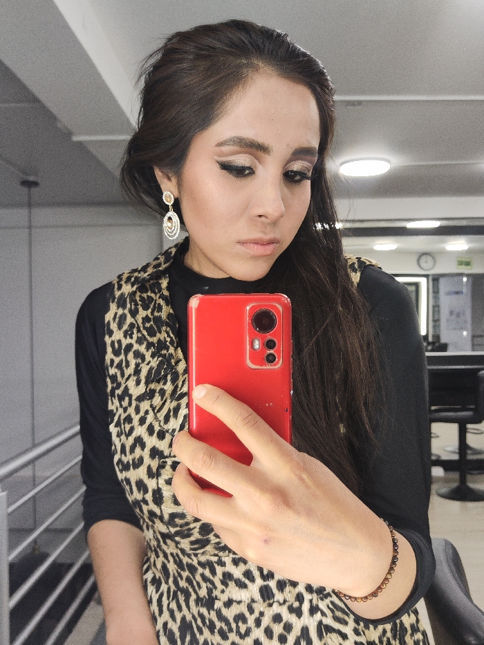 A woman poses for a selfie, holding a red smartphone. She wears a black long-sleeved shirt and a leopard-print vest. She has light brown skin, dark hair, and striking eye makeup. A circular, dangling earring is visible on her left ear. A delicate brown bracelet adorns her right wrist. The background suggests a salon or studio, with chairs, mirrors, and overhead lighting visible.