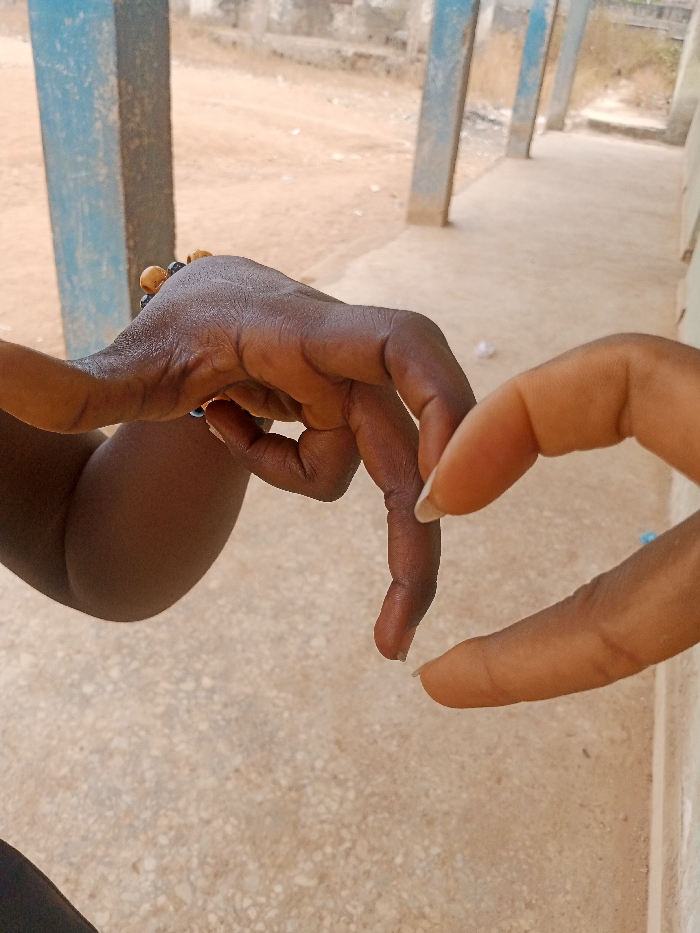 The image captures two human hands, distinct in skin tone, interacting in the foreground within an outdoor setting in Akwanga, Nigeria