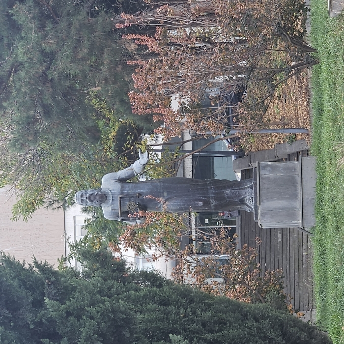 - "A full-length bronze statue of a bearded man, dressed in a long robe, stands centrally on a dark rectangular pedestal" by FM-oPbvC2, licensed under CC BY 4.0