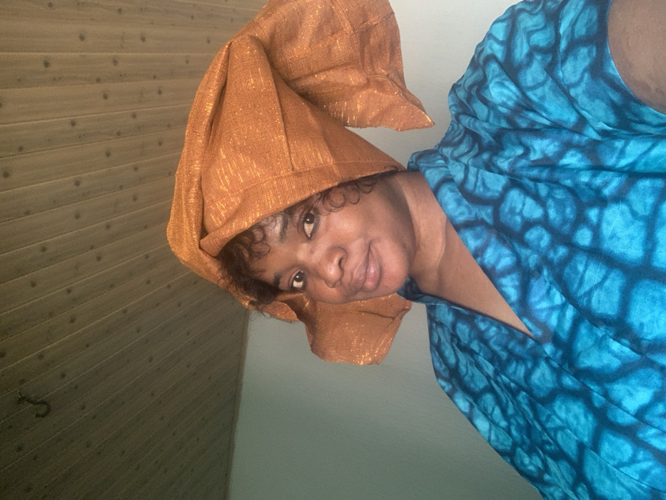 The image depicts an indoor scene in what is described as Barakin Akawo, Nigeria. An adult female is featured in a close-up, chest-up shot, positioned slightly left of center and looking towards the camera with a gentle, closed-mouth smile. Her dark, curly hair frames her face, partially covered by a prominent, structured headwrap made of shimmering orange fabric. She is dressed in a teal or turquoise garment with a dark, abstract, organic pattern and a V-neckline. The background consists of a plain light blue-green wall on the left side and a light-colored wooden plank ceiling. A small, dark, S-shaped hook is visible on the ceiling in the upper-left quadrant of the image.