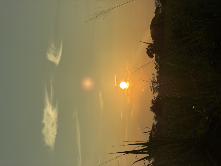 Golden hour bathes a vertical landscape. Sunlight streams through the sky, filtered by elongated wisps of clouds. The glowing sun casts a warm halo. Silhouette vegetation forms a dense, textured border on the right. Tall grasses in the foreground reach towards the light. A solitary palm tree punctuates the horizon. The overall scene evokes a serene, rural setting.