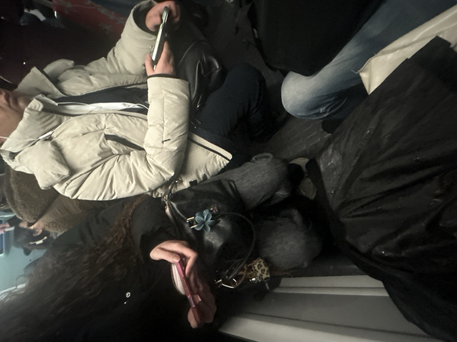 An overhead shot captures a cluttered space, likely a train or subway car. A person in a light-colored puffer jacket holds a phone, while another individual in dark clothing uses a pink device. Bags and belongings are scattered about, including a black purse with a light blue flower detail and a leopard-print keychain. Jeans, a black bag, and other miscellaneous items are also visible, contributing to the congested environment.