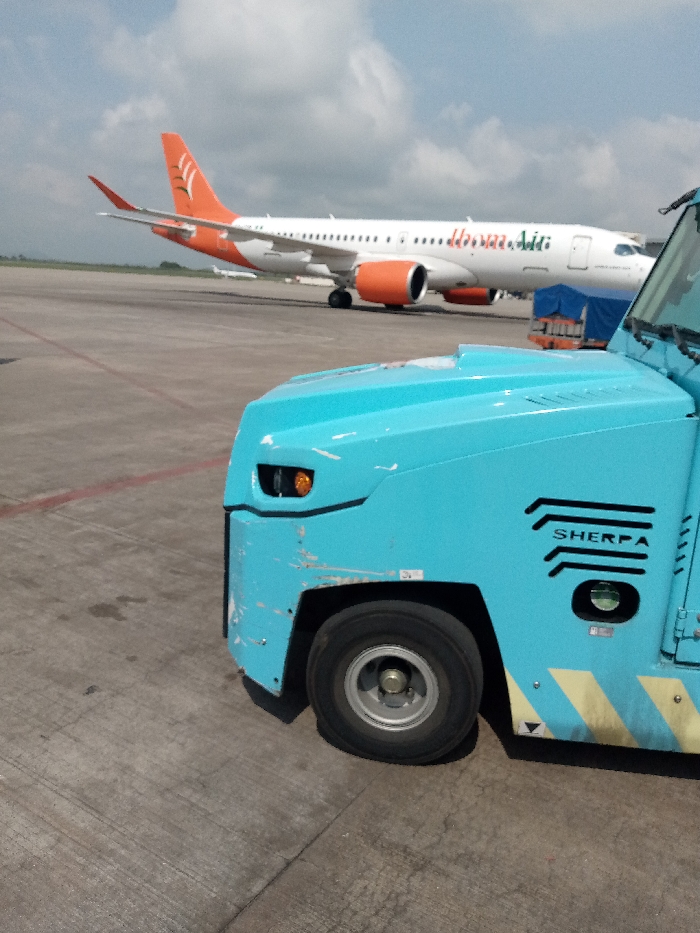 The image depicts an airport tarmac in Gwaska, Nigeria, under a partly cloudy sky. In the foreground, the front-right section of a light blue airport ground support vehicle, identified by "SHERPA" lettering on its side, is visible. This vehicle exhibits scuff marks and scratches on its front panel and has an amber signal light. Its front wheel, with a silver hub, is visible. Yellow and black hazard stripes are present on its lower right side. In the background, a white passenger aircraft with orange tail fins and engine nacelles is stationary on the tarmac. The partial airline branding "Ibom Air" is visible on the fuselage. A blue tarp-covered baggage cart is partially visible behind the aircraft's right wing. No people are visible in the scene.