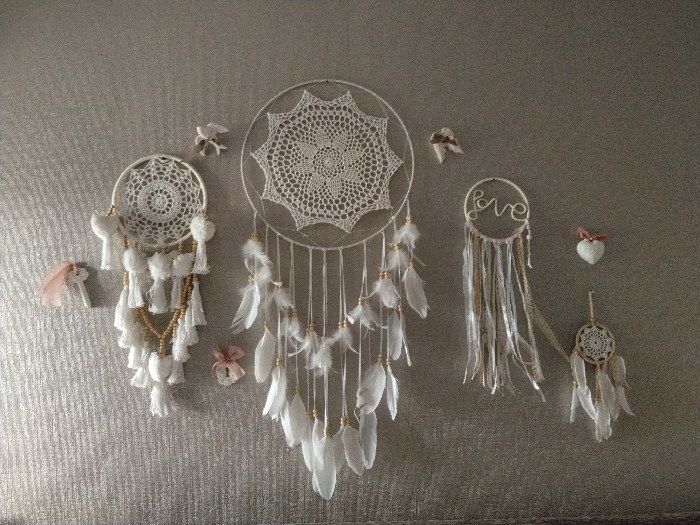 The image displays a wall adorned with five white dreamcatchers and several decorative elements in a room located in Vila Real, Portugal. The central object is a large, circular dreamcatcher with an intricate white crocheted web forming a starburst pattern. From its lower rim, approximately eighteen strands descend, each terminating in a white feather and featuring small golden spherical beads. To the left of the central dreamcatcher is a smaller, circular dreamcatcher with a white crocheted web. This one features numerous white fabric tassels and small white yarn pom-poms interspersed with strands of small golden cylindrical beads. A small, light pink fabric bow is affixed to the wall slightly to the upper left of this dreamcatcher. To the right of the central dreamcatcher and slightly above a mid-line, is a smaller circular hoop forming a dreamcatcher, with the word "love" formed in white wire within its upper interior. Multiple strips of white and light beige fabric, lace, and yarn hang from its lower half. Below and to the right of the "love" dreamcatcher is the smallest of the dreamcatchers, a tiny circular piece with a simple white crocheted web, from which hang short white feathers and golden beads. Additional wall decorations include: * Two small, stylized white bird figurines with wings extended, affixed to the wall: one positioned above the left dreamcatcher, and another between the left and central dreamcatchers. * One white, textured heart-shaped ornament, topped with a small pink ribbon bow, affixed to the wall above and to the right of the "love" dreamcatcher. * A small, light pink fabric bow affixed to the wall below the central dreamcatcher. The background is a light grey or silver-toned wall featuring a subtle vertical textured pattern. No people, actions, or interactions are depicted.