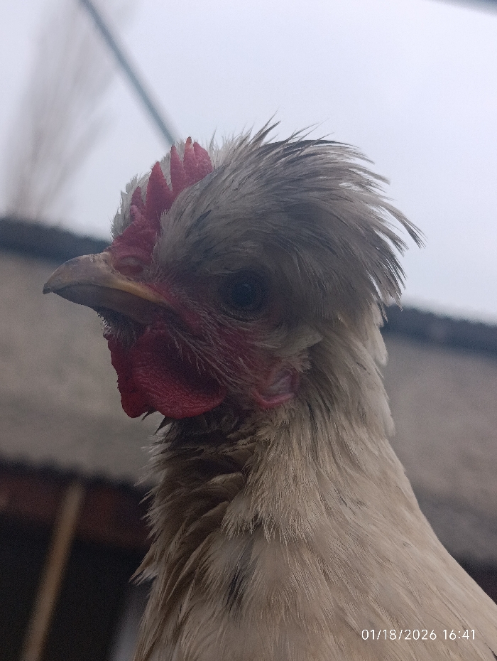The image presents a close-up, profile view of a chicken, positioned in the upper center and left of the frame, facing left. The chicken exhibits light gray to off-white plumage, particularly on its head, neck, and upper body. A prominent feature is a red, serrated comb atop its head and visible red wattles beneath its beak and chin. A distinct crest of ruffled, light gray feathers extends from the top of its head backwards. Its eye is dark, and its beak is a light tan color. The background is out of focus, revealing an overcast, light gray sky above blurred, dark structures, possibly rooftops or fences. A thin, dark, linear object, resembling a wire or pole, traverses diagonally in the upper left quadrant of the background. The scene is set in Bekabad, Uzbekistan. A timestamp "01/18/2026 16:41" is present in the lower right corner of the image.
