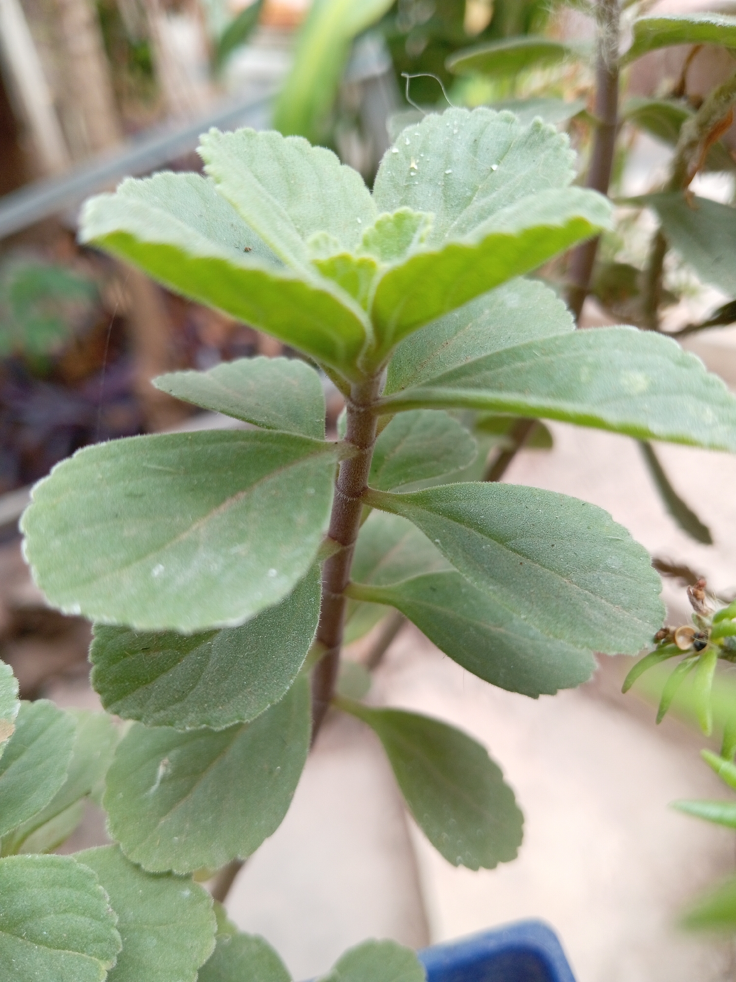 A close-up photograph features a green plant with rounded, scalloped leaves and a brown stem