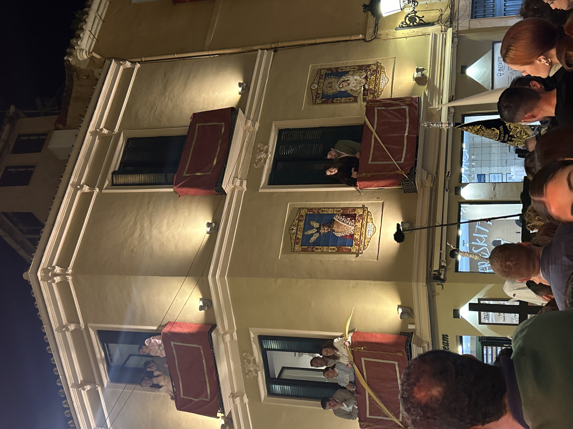 At night in Málaga, Spain, a multi-story building facade is depicted. Windows on each level feature small red-draped balconies. Occupants are visible in the windows and on the balconies. Two decorative tiled images are displayed on the building exterior between the windows. A crowd of people fills the street, observing the building.