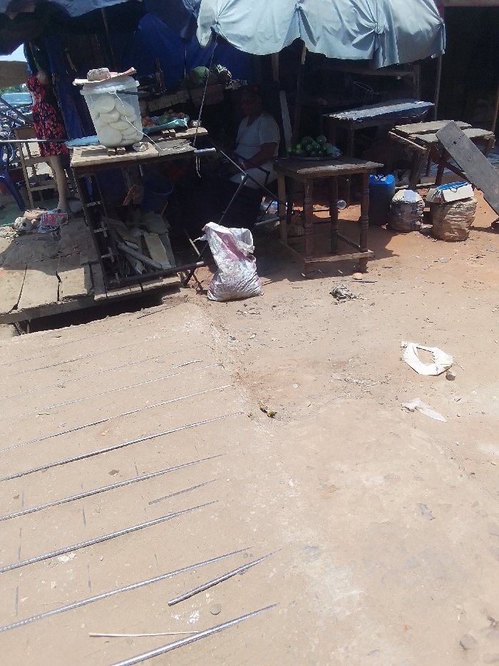 The image captures an outdoor market or roadside vendor stall in Nsugbe, Nigeria, under bright daylight conditions. In the foreground, a stretch of unpaved, light brown earth is visible. Approximately ten parallel lengths of metal rebar are laid horizontally on this ground, extending from the bottom left towards the center. The ground appears uneven, with some surface irregularities. A concrete-lined ditch or gutter runs across the mid-ground, separating the foreground from the vendor stall area. Beyond this ditch, a makeshift stall operates under a combination of light grey and blue tarpaulin canopies, providing shade. Within the stall area, a male individual wearing a light-colored shirt is seated on a dark-colored folding chair. He is positioned towards the center-left, facing generally to the right. To the far left, partially visible behind a display, a second individual wearing a red and white patterned dress stands. Multiple wooden tables are present. On a table to the left, a clear plastic container holds several white, disc-shaped food items. Another wooden table, with turned legs, is situated to the right of the seated individual and displays a pile of green fruits. A large, off-white sack, appearing partially filled, rests on the ground near the seated individual. Behind the tables, various objects are discernible, including a blue plastic jerry can, bundled items wrapped in what appears to be burlap or plastic, and additional wooden planks. The ground within the stall area is also unpaved dirt, consistent with the foreground. Scattered debris, including a piece of white plastic, is visible on the ground.