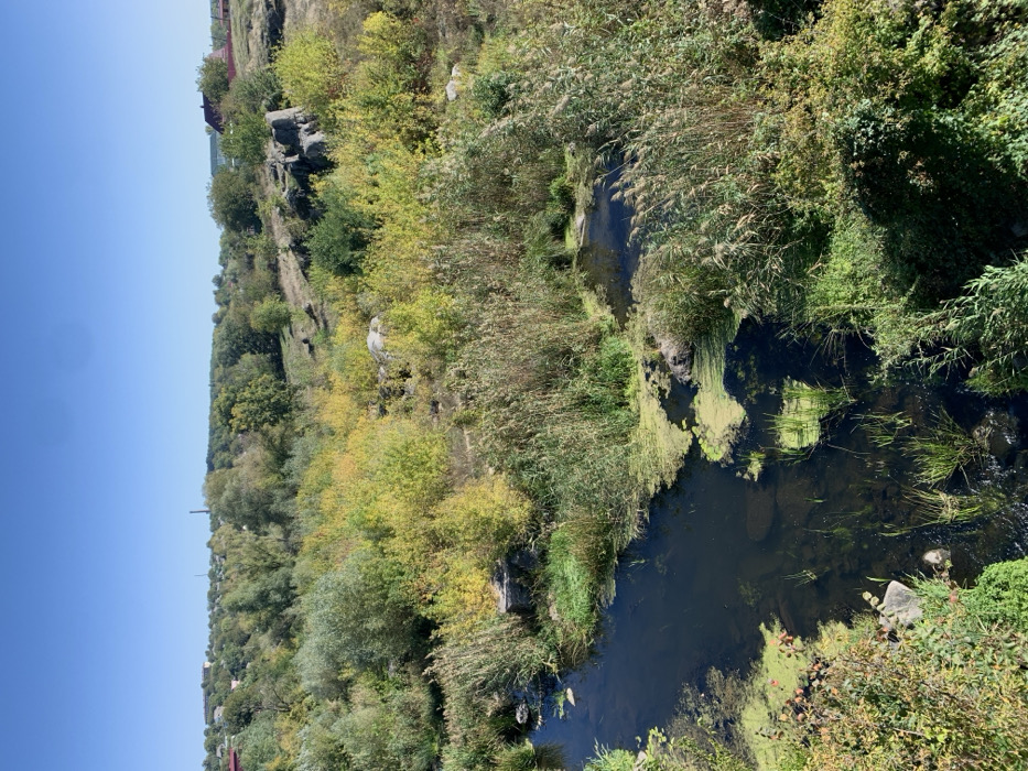 The image presents a daytime, elevated view of a natural landscape within the city of Bohuslav, Ukraine. A dark, winding river, partially covered by patches of light green algae and duckweed, flows from the lower left through the center and exits to the right. Its banks are densely populated with reeds and tall grasses. The immediate and mid-ground terrain consists of sloping ground covered in mixed vegetation, predominantly shrubs and trees displaying various shades of green and yellow autumnal foliage. Several large, gray rock outcrops are visible among the vegetation, particularly in the mid-ground right. In the distant background, a residential area is visible on a ridge, characterized by building rooftops and a prominent industrial chimney or tower. The sky is clear and blue. No individuals, animals, or specific human activities are depicted.