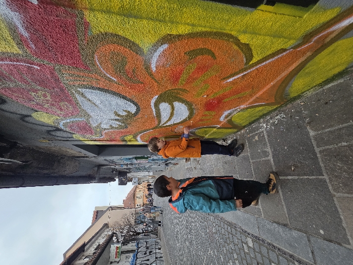 The image depicts two young boys on a pedestrian street within the historic city center of Ljubljana, Slovenia, characterized by cobblestone pavement and old European architecture. The scene is dominated on the right by a heavily graffitied wall featuring a large, stylized orange, red, and yellow creature or monster with white accents against a lime green background. One boy, positioned to the right, wears an orange puffy jacket, dark pants, and dark shoes. He is actively engaged in drawing or writing on the lower portion of the graffiti wall with a light-colored implement held in his right hand. The second boy, standing slightly to the left and behind the first, wears a teal and orange puffy jacket, dark pants, and tan/brown shoes. He is observing the wall and the other boy's activity. The street itself is paved with irregular grey cobblestones, while the sidewalk where the boys stand consists of large, rectangular grey stone slabs. In the background, other pedestrians are visible walking along the street. Buildings lining the street exhibit traditional multi-story architecture with pitched roofs. One building on the left side of the street in the distance features a partially visible green sign with red, yellow, and green colors. The sky is overcast and light grey, suggesting cool weather.