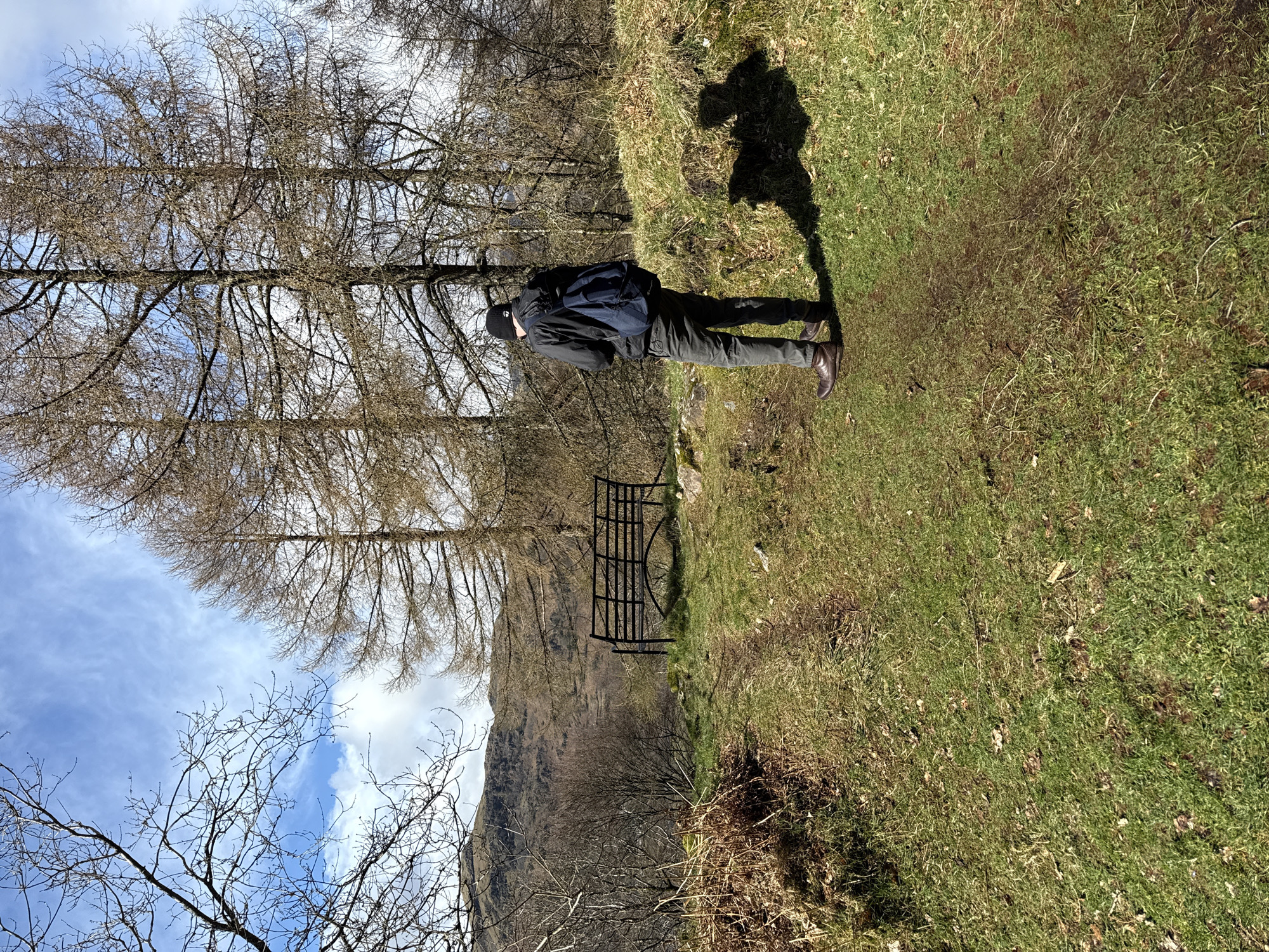 The image depicts an elevated outdoor scene in Grasmere, United Kingdom. A single adult individual, viewed from behind and slightly right of center, stands on a grassy dirt path. The person wears a dark beanie, a dark jacket, dark trousers, and dark brown boots, carrying a navy blue backpack. A distinct shadow extends from the individual to their right on the grassy ground. To the left, a black metal slatted bench with an arched base is positioned on a small rise, facing outward. The foreground and midground consist of green grass, interspersed with brown, dry vegetation and a pile of bracken on the left. Tall, slender trees with sparse, light brown foliage dominate the right side and background, alongside bare deciduous trees. Distant, sparsely vegetated hills or mountains are visible under a partly cloudy blue sky, indicating strong sunlight.