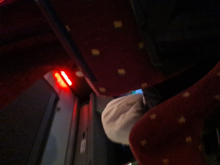 A low-angle shot inside what appears to be a train or bus. Red patterned seats dominate the view. A white baseball cap is visible between the seats. To the left, a dark gray wall features two illuminated red stripes. The overall lighting is dim, creating a claustrophobic feel. The perspective is slightly tilted.