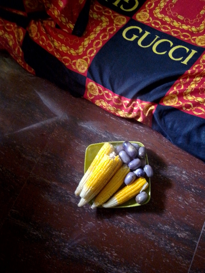 Location: Unknown, Unknown. The scene depicts an indoor still life from an elevated perspective. In the lower right quadrant, a light green, square plastic plate rests on a dark brown surface, consistent with polished wood or tiled flooring. The plate contains five partially husked cobs of corn, displaying bright yellow kernels with white bases, varying in length from approximately 10 to 15 centimeters. Adjacent to the corn cobs, approximately 15 to 20 small, unpeeled, dark purple, ovoid-shaped tubers or legumes are clustered. To the upper left and extending across the upper portion of the frame, a textured fabric item is visible. This textile features a repeating pattern of gold chains and medallions on alternating red and black backgrounds. The word "GUCCI" is prominently displayed in yellow capital letters on a black section of the fabric. No individuals are present. The lighting suggests an interior setting, possibly illuminated by artificial light or indirect natural light.