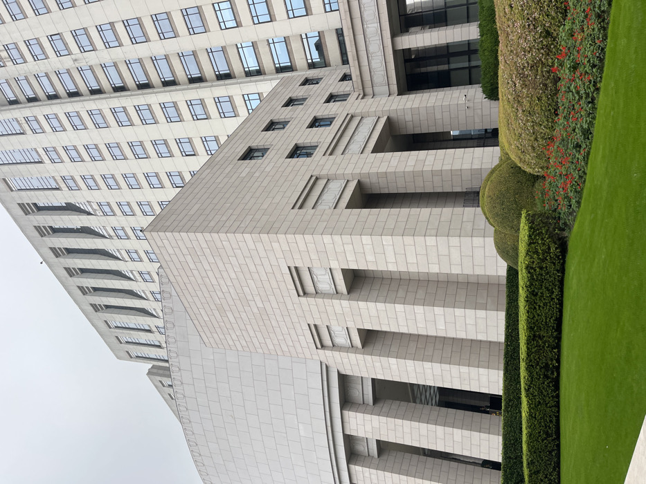 - "A low-angle perspective captures two buildings; a taller one with numerous windows and a smaller, angular structure featuring stone columns" by FM-VYYYD2, licensed under CC BY 4.0