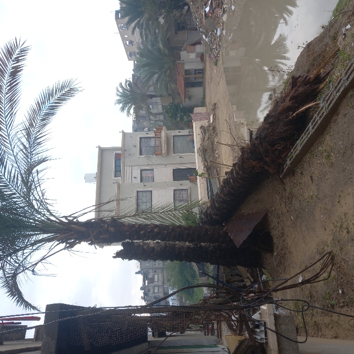 The image captures an urban environment in Khan Yunis, Palestinian Territory, under an overcast sky. In the foreground, on the left, a damaged structure with exposed rebar and tangled electrical wires sits on a concrete ledge. Two upright palm tree trunks stand centrally, one with green fronds extending into the upper frame. A third palm tree lies horizontally on the sandy ground to the right of the upright trunks, its root ball visible and extending towards a body of water. A piece of corrugated metal is partially visible near the base of the standing trees. In the mid-ground, a multi-story building with a light-colored facade, multiple windows, and a small balcony is prominent. Its exterior shows numerous small, dark impact marks. The ground in front of this building is uneven and muddy. To the right of the fallen tree, a large, murky pool of standing water reflects the grey sky. Further in the background, a small, low-lying structure with a reddish roof is situated amidst piles of debris and rubble. Additional residential buildings, some appearing damaged, and several palm trees are visible in the distance. No people are present in the scene.