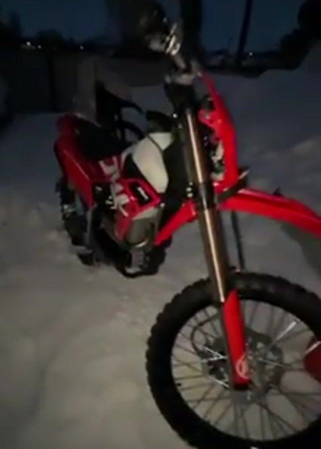 A red and white dirt bike sits in the snow. The camera pans around the bike slowly, showing the front and side. The background is dark with some trees and houses visible. The ground is completely covered in snow.